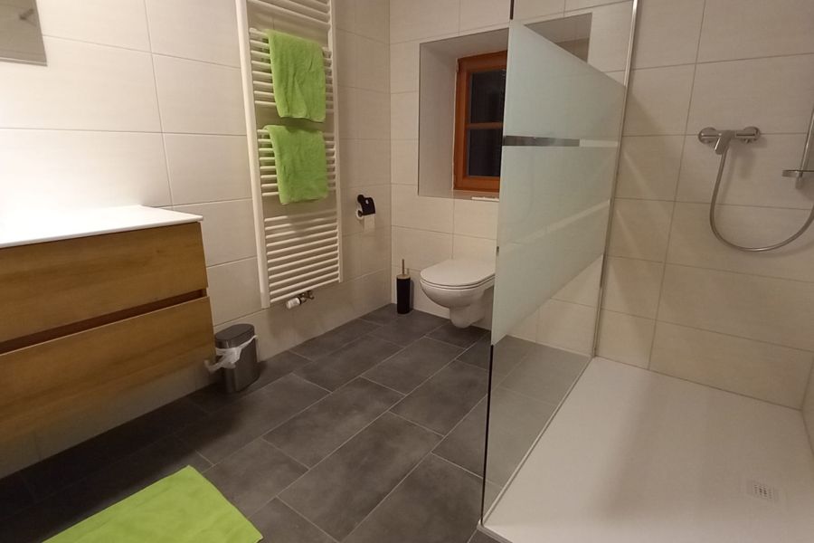 Die Ferienwohnung "Fuchs" bietet zwei separate Schlafzimmer mit Doppelbetten und jeweils einem eigenen Bad mit Waschtisch, Dusche und WC. Im Wohnraum steht eine (Bett-)Couch, auf der eine Person ausgezeichnet schlafen kann (qualitativ hochwertig mit Matratze). Die moderne Küche mit Essecke und Stein-Arbeitsplatte lässt keine Wünsche offen.